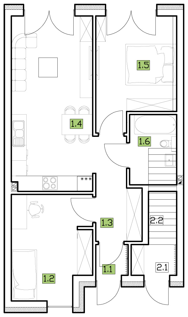 W skład apartamentu wchodzą: jasny salon połączony z jadalnią i aneksem kuchennym, dwie komfortowe sypialnie, łazienka, praktyczne pomieszczenie techniczne, przedpokój oraz wiatrołap. Dodatkowym atutem jest prywatny ogródek, do którego prowadzi wyjście bezpośrednio z salonu, oraz przypisane miejsce parkingowe.